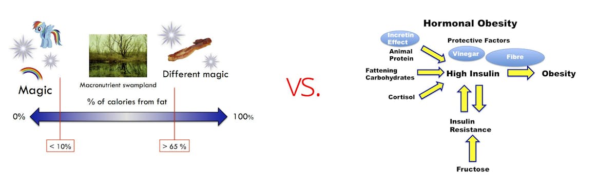 Is it because of different kinds of “magic”, as the provocative long blog post from Denise Minger argues? This is the left illustration above. Or is it all possible to explain via the effect on hormones, primarily insulin, pictured above to the right?