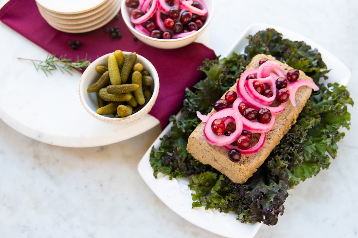 - Slice the pâté and serve with pickled red onions and cranberries as well as dill pickles if desired.
