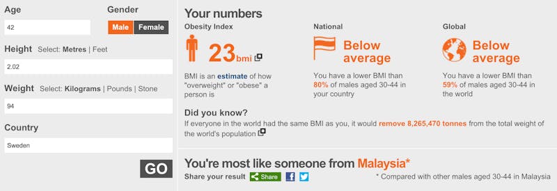 Själv var jag på Malaysisk nivå när det gäller BMI, om än inte när det gäller längd. Hur gick det för dig?